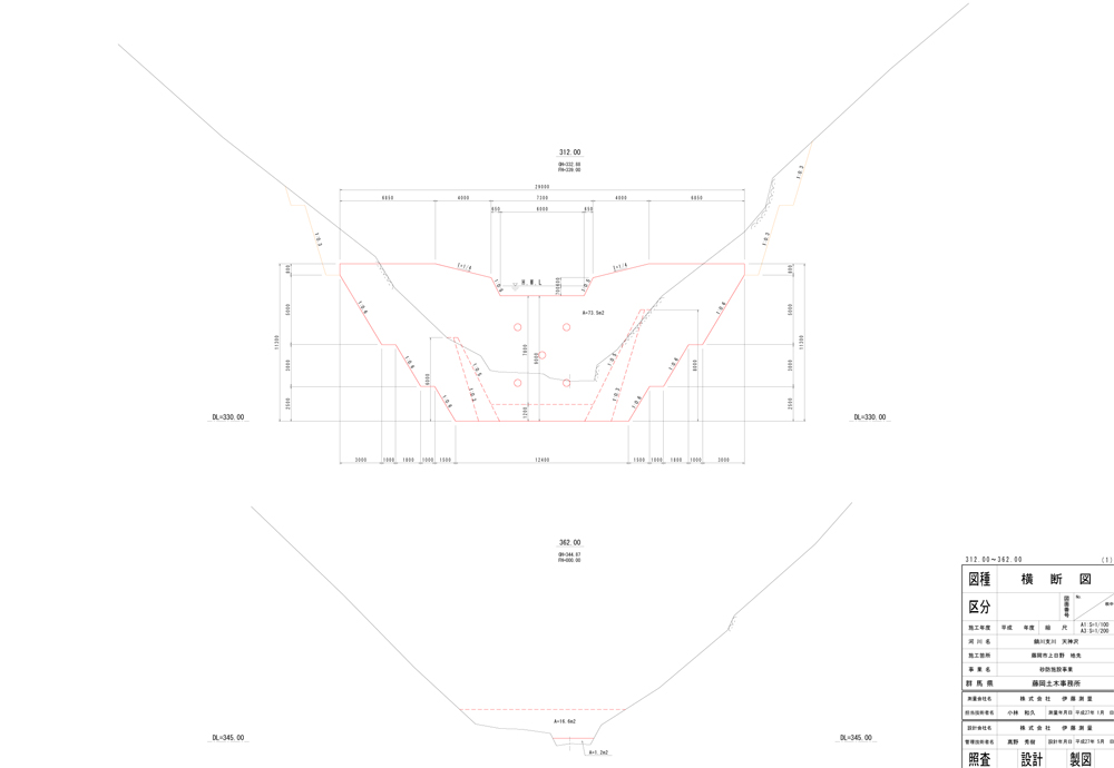 黒坂石ダム堆砂測量委託 (①河川定期横断測量 直接水準(山地)・・・10測線:19.10m ②ダム・貯水池浅深測量 水深3m超え・・・8測線:45.53m 水深1m以上3m以下・・・1測線:10.86m ③ダム堆砂状況報告書作成) |